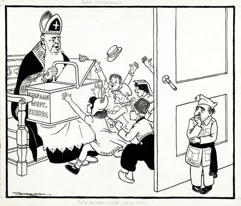 Politiek tekenaar Leo Jordaan maakte in juni 1948 deze prent voor Het Parool onder de titel "Late Sinterklaas. Wie de koek krijgt, wie de gard." Sinterklaas Marshall geeft de trouwe bondgenoten van de Verenigde Staten, gehuld in traditopnele klederdracht, gul uit de kist met hulpgoederen. Het stoute jongetje Franco krijgt niets en staat beteuterd buiten. Spanje was immers geen democratie en had bovendien in de Spaanse burgeroorlog hulp gekregen van Hitler en Mussolini. Jordaan had blijkbaar niet veel vertrouwen in het politieke inzicht van zijn publiek. De namen van landen en personen zijn vermeld als extra-service.