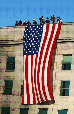 Hulpverleners ontrollen een enorme Amerikaanse vlag vanaf het dak van het Pentagon na de aanslagen van 11 september 2001. (Bron: Wikicommons)