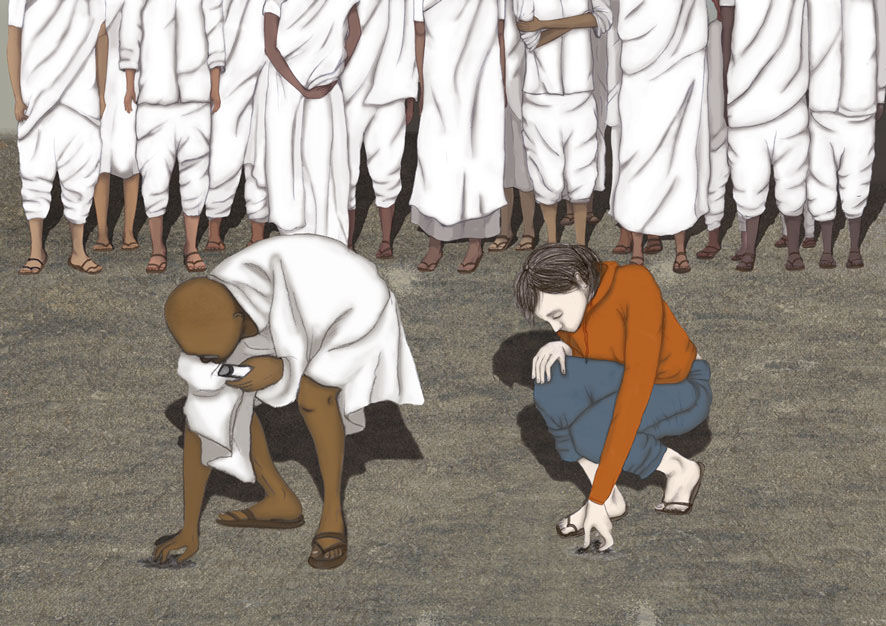 We beginnen in Sabarmati Ashram met 78 man. Gandhi vraagt uiterste concentratie en discipline van ons. We lopen 23 dagen en rusten en slapen in de open lucht. We vragen in dorpen om een eenvoudige maaltijd en water. Elke dag sluiten zich meer mensen aan bij de Zoutmars. Steeds wanneer Gandhi een toespraak houdt worden we vervuld met hoop en de wil om ons te verzetten tegen de onderdrukking door de Engelsen. Het is een zware tocht maar als Gandhi spreekt weten we weer waarom we dit doen.