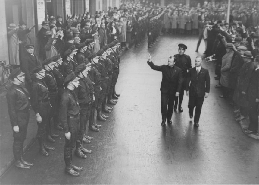 Mussert inspecteert de Weerbaarheid Afdeling (WA) op de eerste landdag van de NSB die werd gehouden op 7 januari 1933 te Utrecht. Bij de intocht van de WA'ers in de Domstad brachten medestanders de fascistengroet en gaven tegenstanders luidruchtig uiting aan hun afkeer van de paramilitaire organisatie van de NSB met kreten als 'kapitalisten-knechten'en 'nou effe de mieterjeur erop!'. Foto en bijschrift uit De NSB