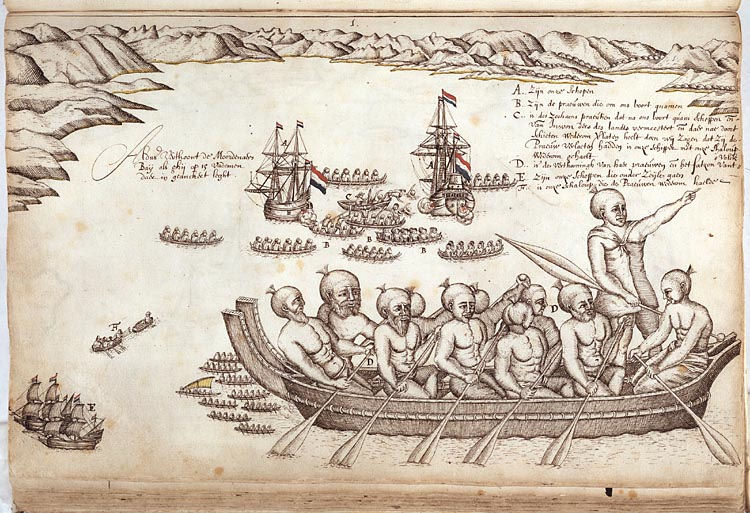 Bron: Nationaal Archief, Illustratie uit het scheepsjournaal van Abel Tasman