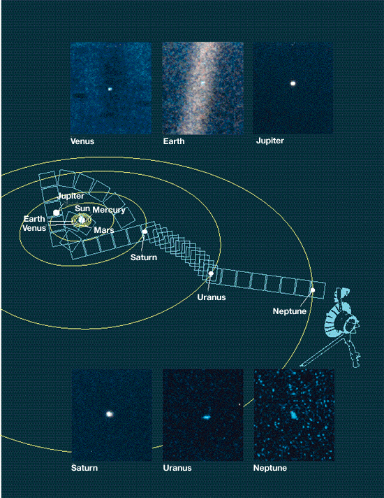 De resultaten van het Voyagerproject zijn zeer interessant, maar het project is veel bescheidener en daarom waarschijnlijk ook veel minder bekend, dan de grote projecten uit de hoogtijdagen van de ruimterace. De ruimterace, begonnen met de Sovjet-satelliet Sputnik in 1957, was feitelijk alweer voorbij met de landing van Neil Armstrong en Buzz Aldrin op de maan in 1969. In die korte periode werden de allereerste mijlpalen van de ruimtevaart bereikt: de eerste mens in de ruimte, de eerste ruimtewandeling, en natuurlijk de eerste mens op de maan. Ook de eerste foto van de aarde vanuit de ruimte werd in deze periode gemaakt. Maar deze mijlpaal werd op 14 februari 1990 door Voyager 1 ruimschoots overtroffen; op die dag maakte Voyager, na het passeren van de buitenste planeet Pluto, een familieportret van ons zonnestelsel, de eerste foto ooit van het zonnestelsel 'van buitenaf'! Op deze fotoserie zien we de zon en zes van de negen planeten (in afstand van de zon: Venus, Aarde, Jupiter, Saturnus, Uranus, Neptunus). Zelfs de grote gasreuzen Jupiter en Saturnus zijn niet meer dan blauwe stipjes!