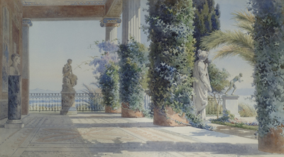 Aquarel 'Doorkijk naar de collonade van de peristyle van het Achilleion', A. Giallina, ca. 1910.