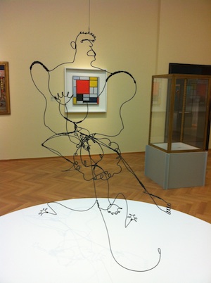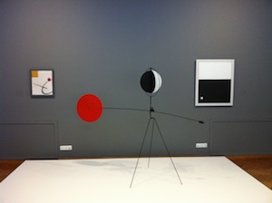 Het fysieke en inhoudelijke middelpunt van de tentoonstelling is een reconstructie van het Parijse atelier van Mondriaan. Hierdoor krijg je als bezoeker de ervaring die Calder in 1930 kreeg. Je stapt uit de figuratieve circuswereld en in het atelier dat zich als een abstract driedimensionaal schilderij om je heen vormt. De schok die Calder daar onderging, bracht hem, in combinatie met de driedimensionale beweging waar hij mee bezig was, op het pad van de abstractie. Zo begon hij te werken aan zijn mobiles, bestaande uit allerlei combinaties van abstracte vormen. In navolging van zijn circusfiguren, liet hij ook zijn abstracte werken bewegen. Eerst met motortjes, later op natuurlijke wijze. De Calder Foundation heeft bepaald dat de werken niet meer mogen bewegen. Zo hebben de suppoosten in het Peggy Guggenheim Museum in Venetië er een dagtaak aan om mensen ervan te weerhouden tegen de mobiles te blazen. Ik ben benieuwd hoe dit de suppoosten in het Gemeentemuseum zal vergaan.