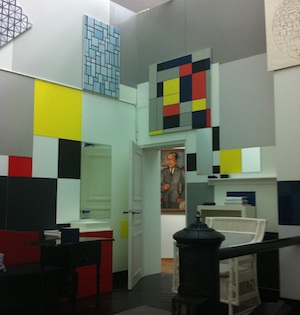 3) Reconstructie Atelier Mondriaan, door Frans Postma (TU Delf), met in de deuropening zicht op schilderij door Gerard Hordijk, Portret van Piet Mondriaan, 1927
