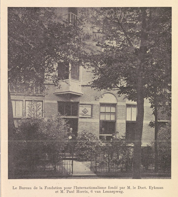 De beroemde röntgenoloog, natuurarts, hygiënist, antropoloog en pacifist Pieter Eijkman (foto Haags gemeentearchief rechts) en zijn privésecretaris, vrijdenker, pacifist, en spiritist Paul Horrix (foto Haags gemeentearchief links onder) richtten in de maanden voorafgaand aan het onderhoud met De Bazel uit puur idealisme een ‘Voorbereidend Bureau der Stichting voor Internationalisme’ op. Zij waren hiertoe gestimuleerd door de Interparlementaire Conferentie in Brussel, waar overeengekomen was om de wenselijkheid van een Internationaal Parlement te onderzoeken als pendant van het Internationale Hof van Arbitrage waartoe men al besloten had.