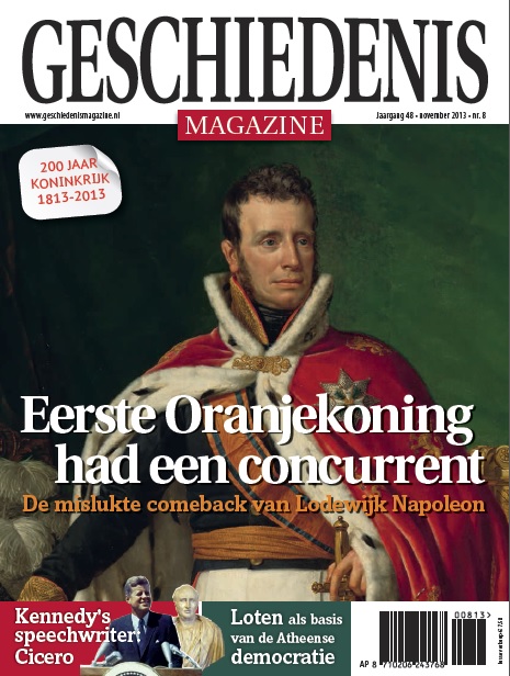 Dat Lodewijk Napoleon de troon niet kreeg, is bekend. Welke machinaties ervoor zorgden dat hij hem niet kreeg, en Willem van Oranje wel – terwijl die laatste al twintig jaar geen voet op Nederlandse bodem had gezet –, leest u in dit zeer lezenswaardige nummer van Geschiedenis Magazine, dat grotendeels in het teken staat van de geboorte van het Koninkrijk der Nederlanden, maar ook aandacht besteedt aan de beroemde ‘Ich bin ein Berliner’-speech van John F. Kennedy (Kennedy’s speechschrijver blijkt sterk beïnvloed te zijn door twee requisitoirs van de Romein Cicero), en aan een belangrijke, maar in de populaire geschiedschrijving veronachtzaamde component van de Atheense democratie, namelijk loting.