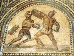 Eén van de spectaculairste en tevens wreedste vormen van volksvermaak in het anders zo beschaafde Romeinse Rijk waren de gladiatorenspelen. Slaven uit alle veroverde rijksdelen traden op in de arena en symboliseerden dus onbewust de eenheid van het imperium. Mensen uit alle bevolkingsgroepen woonden ze bij, de keizers gebruikten ze om hun verbondenheid met alle rijksdelen te tonen en te laten zien dat hun macht over mensen en dieren bijna absoluut was. Maar het adagium "Panem et ( ludos ) circenses" ontaardde in "Sanguinem et circenses". De spelen waren zeer in trek : Meijer vond ruim 200 amfitheaters terug , allemaal in het West-Romeinse Rijk, inclusief Noord- Afrika. De belangrijkste liggen in Frankrijk, Spanje,Italië (koploper met bijna 100), Duitsland, Zwitserland, Oostenrijk, Hongarije, Slovenië, Kroatië, Libië, Tunesië. Het Oosten was ook in dit opzicht beschaafder: in Griekenland, Turkije etc. lagen veel minder en veel kleinere amfitheaters, maar de vele inscripties over gladiatoren kunnen er op wijzen dat er spelen waren, mogelijk in de grote theaters zoals Ephese, die dan een combifunctie hadden: toneel en spelen (122). Bij spelen bleven dan de onderste rijen leeg.