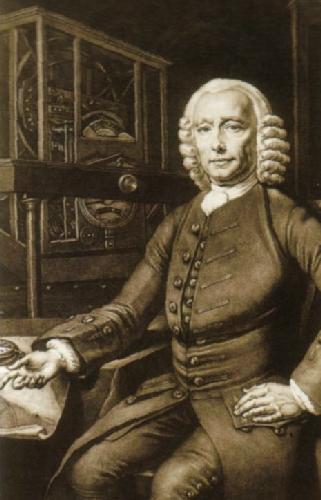 De echte John Harrison in zijn werkkamer. Achter hem een eerder ontwerp van zijn chronometer. Voor hem op de werktafel zijn H4, zijn vierde chronometer uit 1761, uiteindelijk bekroond door de Board of Longitude in 1773.