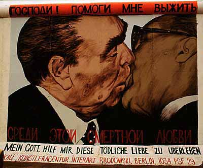 De man rechts op de foto ben je al eerder tegengekomen. De man links op de foto is Leonid Brezjnev. Hij was van 1964 tot 1980 de baas in de Sovjet-Unie. De vertaling van de tekst onder de foto is: Mijn God, help me deze dodelijke liefde te overleven.