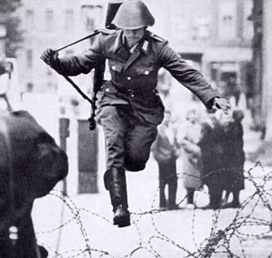 De stad wordt in al tweeën verdeeld door prikkeldaad. Straks is het een muur. De soldaat neemt zijn kans waar. Hij springt naar de vrijheid.