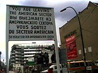 Dit bord zie je op veel fotos uit de Koude Oorlog afgebeeld. Welke talen zie je op het bord? Deze foto is overigens gemaakt nadat de spanning in het gebied sterk was afgenomen. De stad was niet langer verdeeld in sectoren.