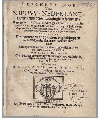 Titelpagina van "Beschryvinge Van Nieuw-Nederlant, (Ghelijck het tegenwoordigh in Staet is)" Dit is een van de eerste boeken over Nieuw-Nederland. Het werd in 1655 geschreven door Adriaan van der Donck die in het gebied woonde en werkte.