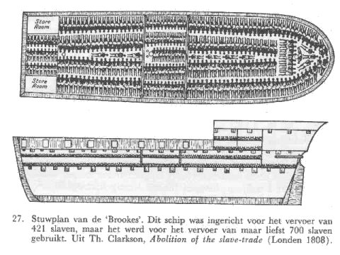 Het gaat om een afbeelding van het slavenschip Brooks (ook wel gespeld Brookes). De meeste kijkers en dat geldt zeker voor die personen die zich al hebben verdiept in het slavernijverleden, zullen dadelijk dat slavenschip herkennen en de barre omstandigheden waaronder slaven werden vervoerd.