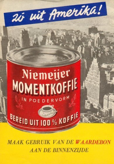 Zó uit Amerika!is een aanbeveling op zich, want alle goede dingen komen in de jaren vijftig uit Amerika. Vrijheid en Vooruitgang voorop. Het blik Niemeijer Momentkoffie wordt dan ook afgebeeld tegen een achtergrond van wolkenkrabbers. Hoogbouw heeft de toekomst.